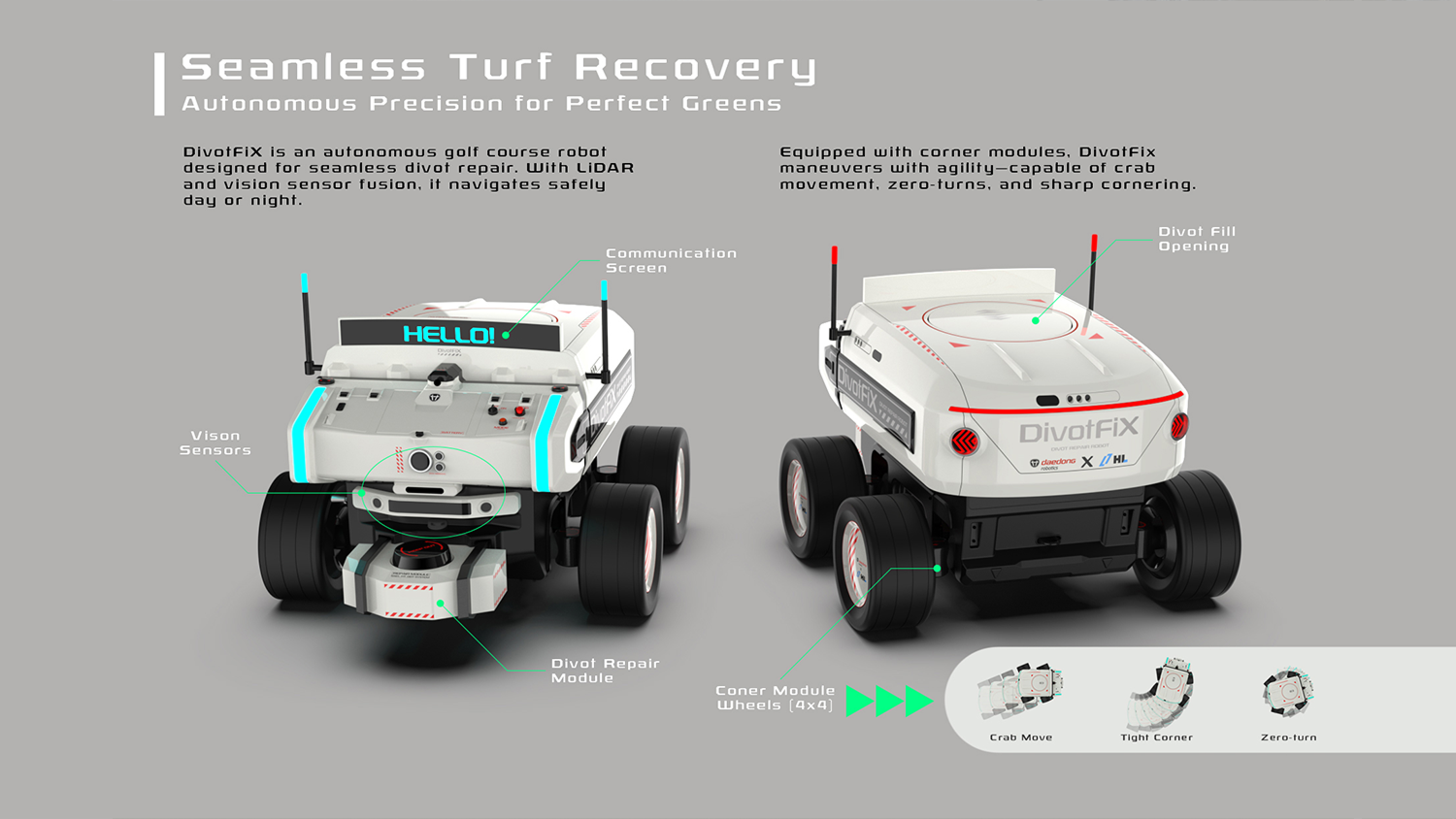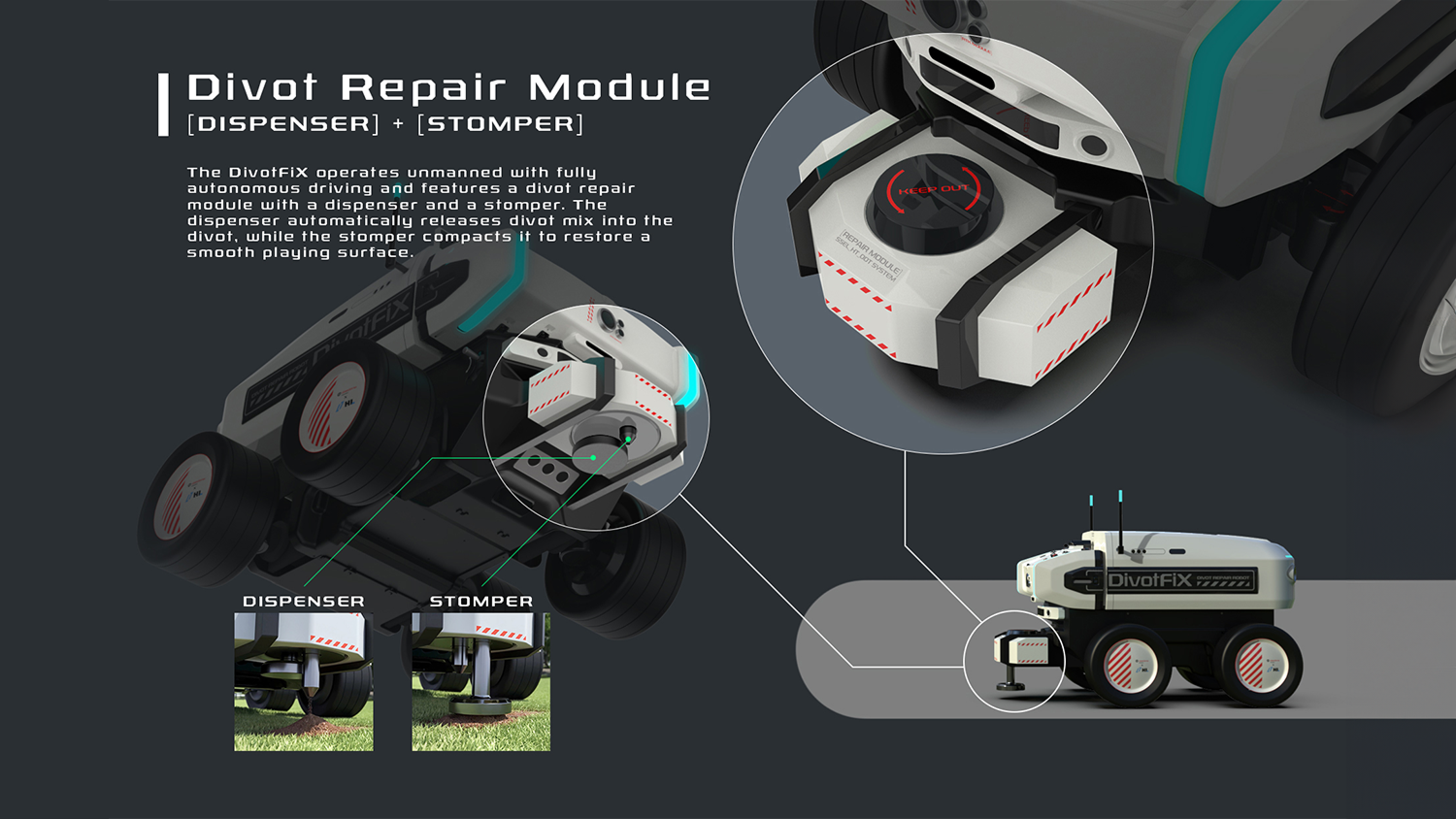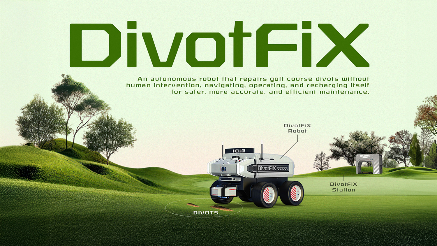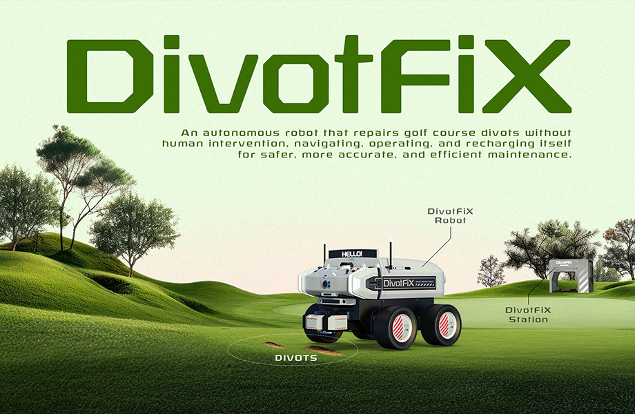DivotFiX is the world’s first autonomous AI robot for repairing divots on golf course fairways. Equipped with AI, LiDAR, and vision-based sensors, it detects divot damage, calculates optimal repair paths, dispenses the exact amount of divot sand, and uses an integrated tamping system for restoration. Traditional repair work exposes staff to injury from golf balls and extreme heat. DivotFiX eliminates these risks, performing safe, unmanned operations both day and night. Its sensors identify people and vehicles to avoid collisions and allow golfers to play undisturbed. After each job, DivotFiX returns home to recharge batteries and refill divot sand. Managers can monitor the robot’s progress and material usage through its AI platform. DivotFiX delivers safer working conditions, lower maintenance costs, improved repair quality, and operational efficiency year-round.