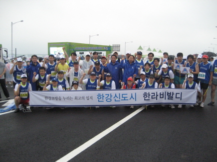 당사 정무현 사장을 비롯하여 마라톤 동호회 및 임직원 50여 명은 김포한강로 개통을 축하하고 <한강신도시 한라비발디>의 성공 분양을 기원하고자 궂은 날씨에도 이 행사에 참여하여 마라톤 코스를 함께 완주하였다.