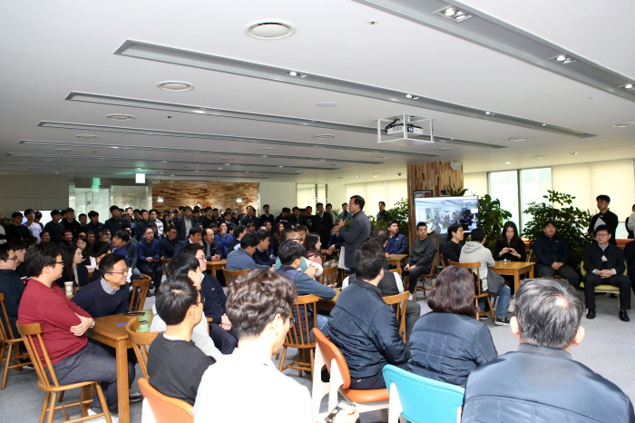 당사는 12월 10일 본사 7층 한라라운지에서 본사 및 인근 현장 임직원들이 참석한 가운데 Town Halla Meeting을 개최했다. 이석민 사장의 주재로 열린 Town Hall Meeting은 지난 1일부터 시행한 조직 개편과 관련한 배경을 전 임직원에게 공유하기 위해 마련됐다. 이날 각 현장에서는 화상회의 시스템을 통해 Town Hall Meeting을 실시간으로 시청하며 참여했다.