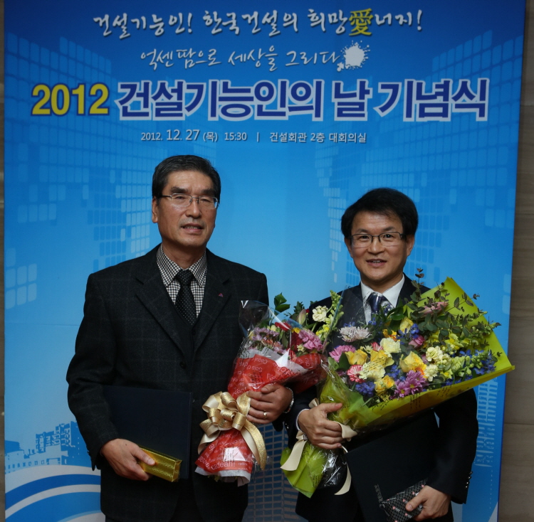 12월 27일 건설회관에서 열린 <제3회 2012 건설기능인의 날> 행사에서 평택시흥고속도로현장(소장 박종진)이 우수 사업장으로 선정되어 당사가 단체표창(국토해양부장관상)을, 이 현장의 이석균 관리차장이 개인표창(고용노동부장관상)을 수상했다. 평택시흥고속도로 현장은 ‘퇴직공제 이행 실태'가 우수하고 ‘외국인 근로자의 날 행사’를 주최하는 등 근로자 복지에 기여한 점을 높이 평가받아 우수 사업장으로 선정되었다.