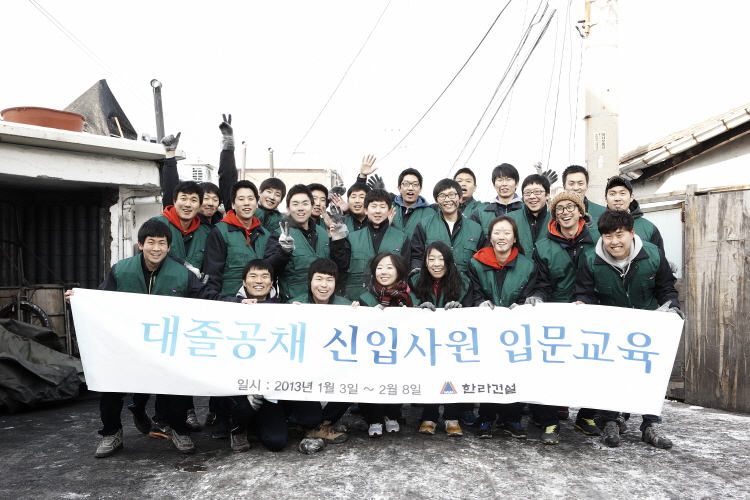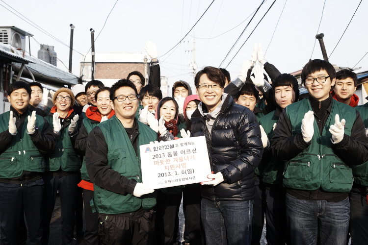 1월 6일 일요일, 2012년 한라건설 신입사원 23명이 송파구 거여동 일대에 거주하는 홀몸 어르신을 위한 연탄배달에 나섰다. 당사는 홀몸 어르신들께 1,900장의 연탄을 지원했으며, 이날 신입사원들은 오전 10시부터 연탄배달을 시작해 2시간 동안 연탄을 배달했다.