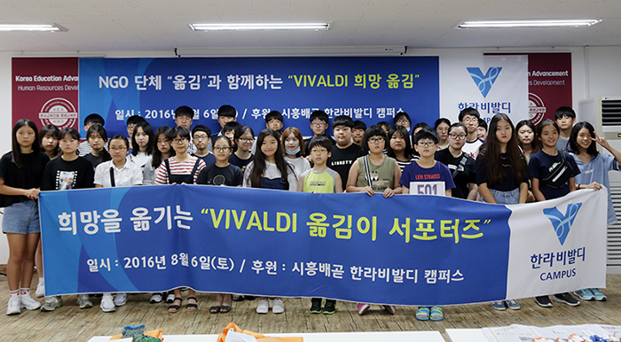 8월 6일(토)에는 “VIVALDI 희망옮김 서프터즈”로 입주민 중고등학생 자녀 50명을 선발하여 NGO단체 ‘옮김’과 함께 한국교육진흥 평생교육원(정왕동 소재)에서 몽당크레파스, 사용하다 버린 비누를 재가공하여 새 크레파스, 새 비누로 재가공하여 어려운 이웃나라에 옮기는 '희망옮김' 활동을 실시했다.