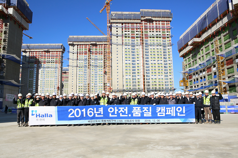 ㈜한라는 올해 4분기 안전·품질캠페인을 시흥배곧3단지APT 현장에서 12월 6일 개최했다. 이날 안전·품질캠페인에는 정몽원 회장, 박철홍 사장 및 관련 임직원을 비롯해 협력업체 대표이사가 참석해 3단지 현장 및 서울대학교 시흥캠퍼스 부지를 둘러보고 안전 및 품질 관리 상태를 점검했다.